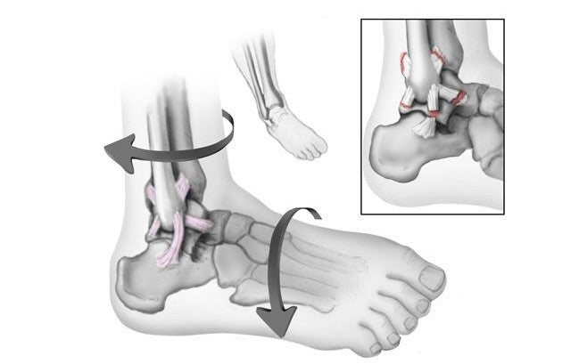 Most sprained ankles occur in the lateral ligaments on the outside of the ankle. Sprains can range from tiny tears in the fibers that make up the ligament to complete tears through the tissue.